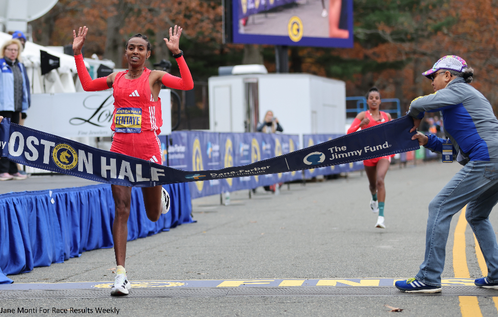 PHOTO: Ethiopia’s Fantaye Belayneh winning the Boston Half-Marathon for the second time in 1:08:51 (photo by Jane Monti for Race Results Weekly)