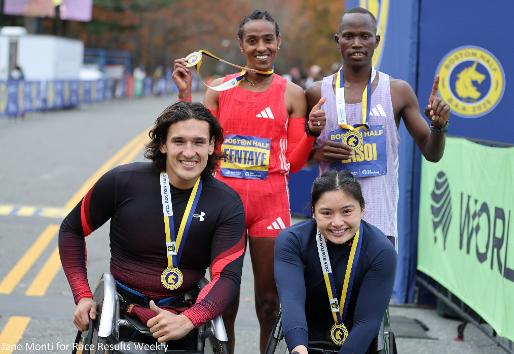 PHOTO: The four open champions of the 2025 Boston Half Marathon: Ethiopia’s Fantaye Belayneh and Kenya’s Isaia Lasoi in the open women’s and men’s categories, and Americans Yen Hoang and Miguel Vergara in the women’s and men’s wheelchair categories (photo by Jane Monti for Race Results Weekly)