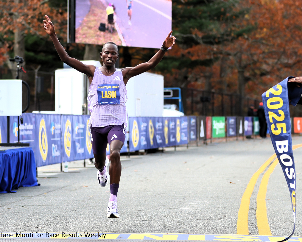 PHOTO: Isaia Lasoi winning the 2025 Boston Half-Marathon in 1:00:59 (photo by Jane Monti for Race Results Weekly)