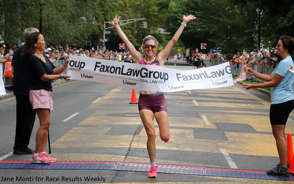 PHOTO: Keira D’Amato winning the 2024 USATF 20-K title at the Faxon Law New Haven Road Race (photo by Jane Monti for Race Results Weekly)