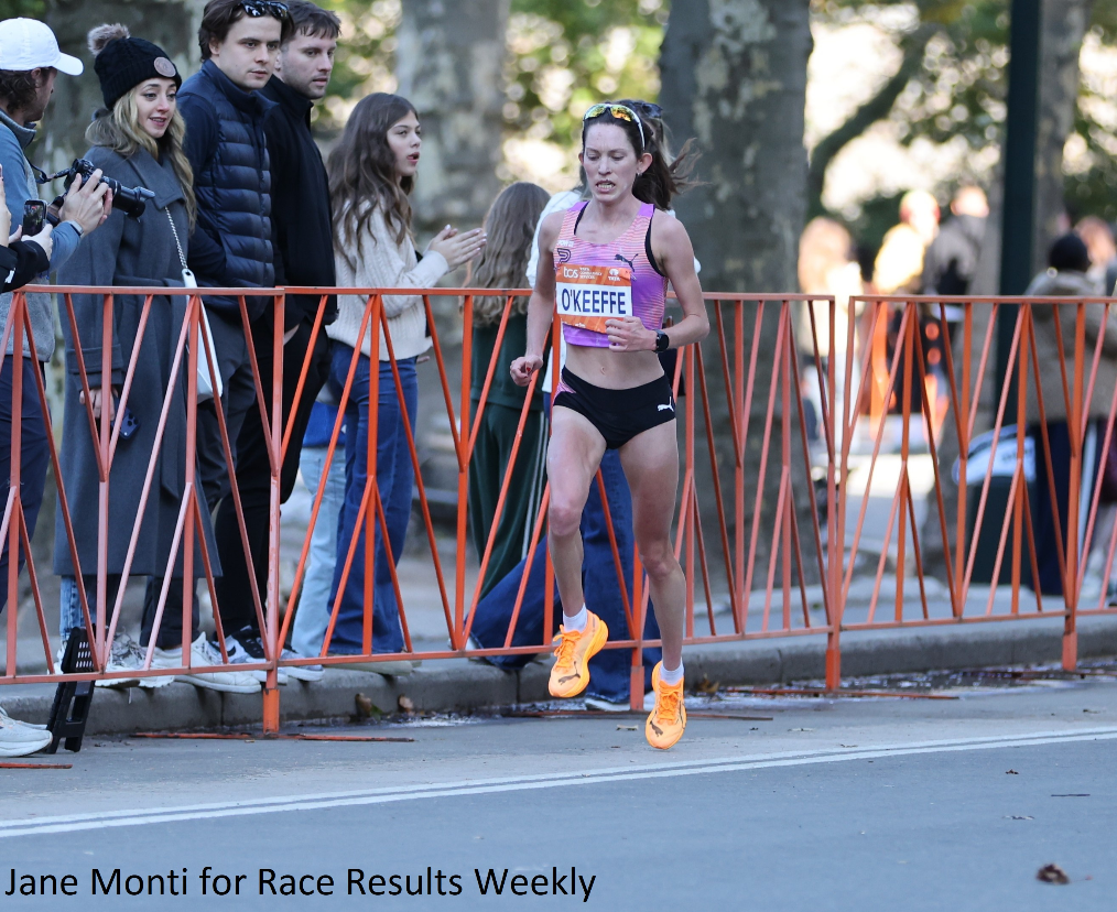 PHOTO: Fiona O’Keeffe, the top American woman at the 2025 TCS New York City Marathon, near the 40-K mark (Photo by Jane Monti for Race Results Weekly)
