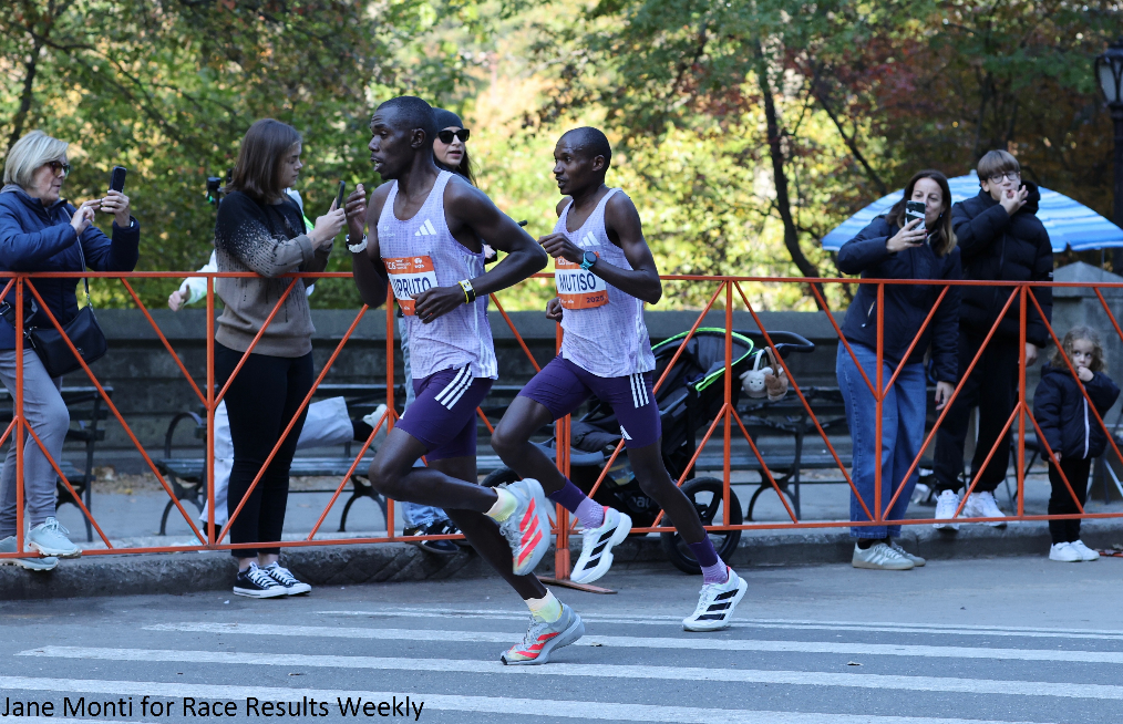 PHOTO: Benson Kipruto and Alexander Mutiso near the 40-K mark at the 2025 TCS New York City Marathon (Photo by Jane Monti for Race Results Weekly)