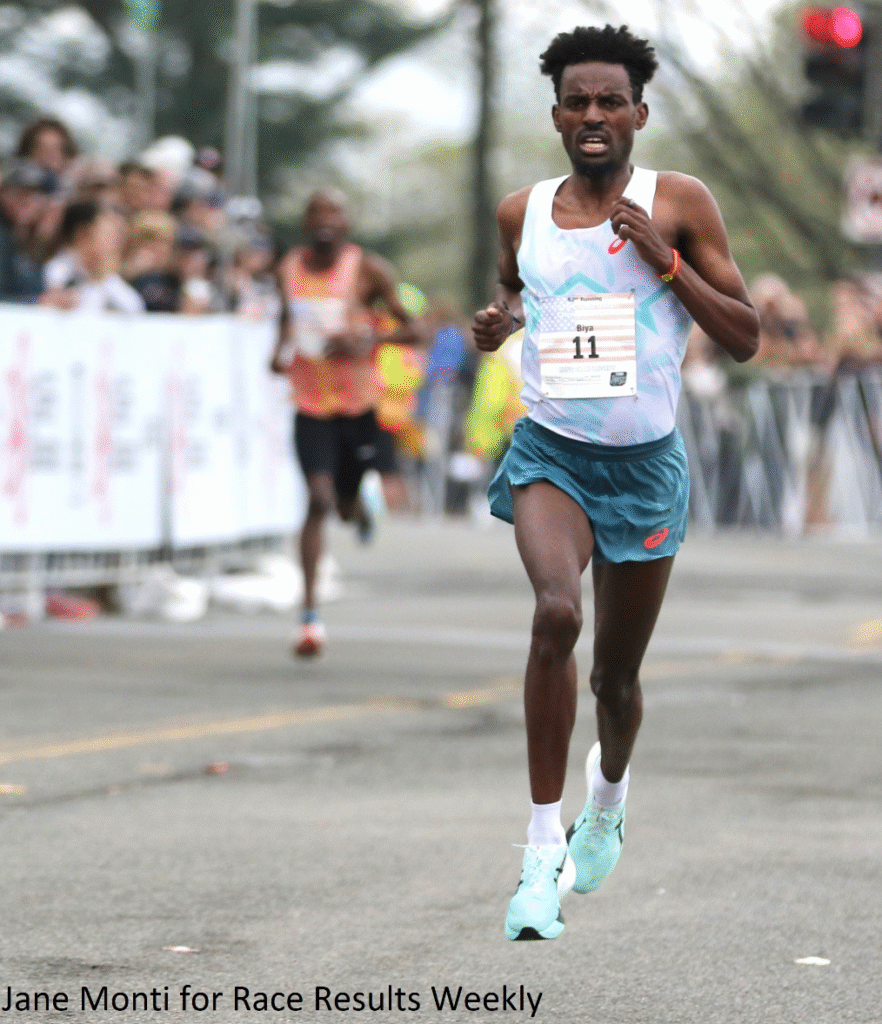 PHOTO: Biya Simbassa finishing third at the 2025 USATF 10-Mile Championships at the Credit Union Cherry Blossom 10-Mile in Washington, D.C. (photo by Jane Monti for Race Results Weekly)