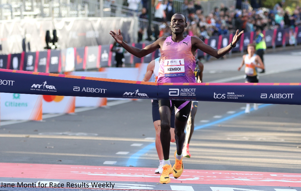 PHOTO: Amon Kemboi winning the 2025 Abbott Dash to the Finish Line 5-K in New York (photo by Jane Monti for Race Results Weekly)
