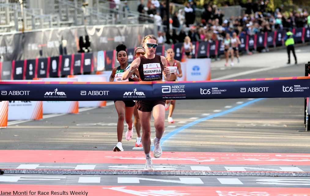 PHOTO: Annie Rodenfels winning the 2025 Abbott Dash to the Finish Line 5-K in New York (photo by Jane Monti for Race Results Weekly)