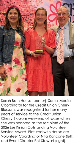 April 11, 2026, Washington, DC: Organizers of the Credit Union Cherry Blossom (CUCB) announced the much-anticipated winner of this year’s Les Kinion Outstanding Volunteer Service Award, as well as the newest inductees into the CUCB Hall of Fame at the pre-race dinner for elite athletes, race committee members, Credit Union Miracle Day partners and special guests held Saturday night, April 11 at the Crystal Gateway Marriott in Arlington, VA.