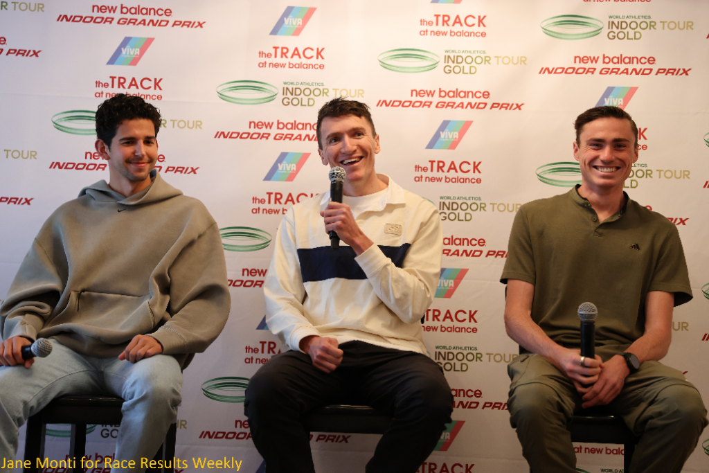 PHOTO: Grant Fisher, Jake Wightman and Josh Hoey speaking to the media in advance of the 2026 New Balance Indoor Grand Prix in Boston (photo by Jane Monti for Race Results Weekly)
