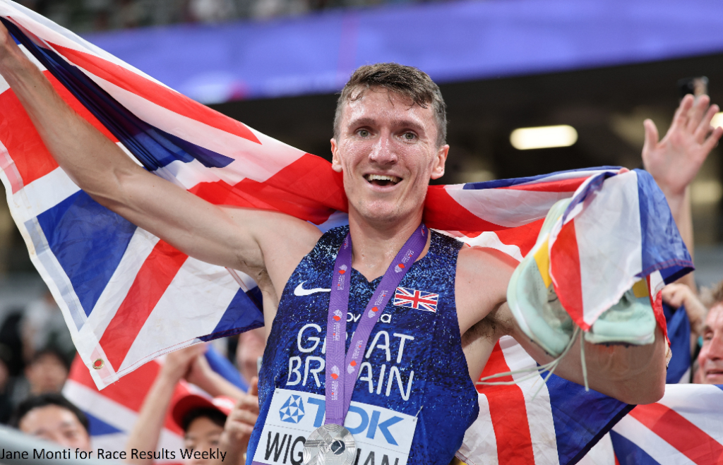 PHOTO: Jake Wightman celebrates his silver medal in the 1500m at the 2025 World Athletics Championships in Tokyo (photo by Jane Monti for Race Results Weekly)