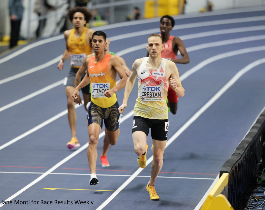 PHOTO: Eliott Crestan of Belgium winning his 800m heat at the 2026 World Athletics Indoor Championships in Toruń, Poland (photo by Jane Monti for Race Results Weekly)