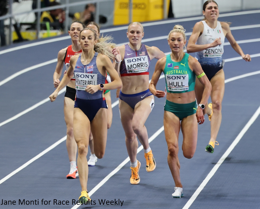 PHOTO: Georgia Hunter Bell of Great Britain, Jessica Hull of Australia, and Gracie Morris of the USA finishing one, two, three in their heat of the 1500m at the 2026 World Athletics Indoor Championships in Toruń, Poland (photo by Jane Monti for Race Results Weekly)