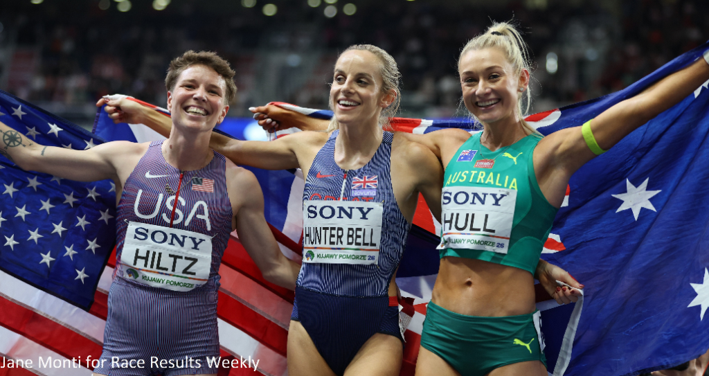 PHOTO: The three podium finishers from the women’s 1500m at the 2026 World Athletics Indoor Championships in Toruń, Poland (left to right): Nikki Hiltz (bronze), Georgia Hunter Bell (gold) and Jessica Hull (silver) – (photo by Jane Monti for Race Results Weekly)
