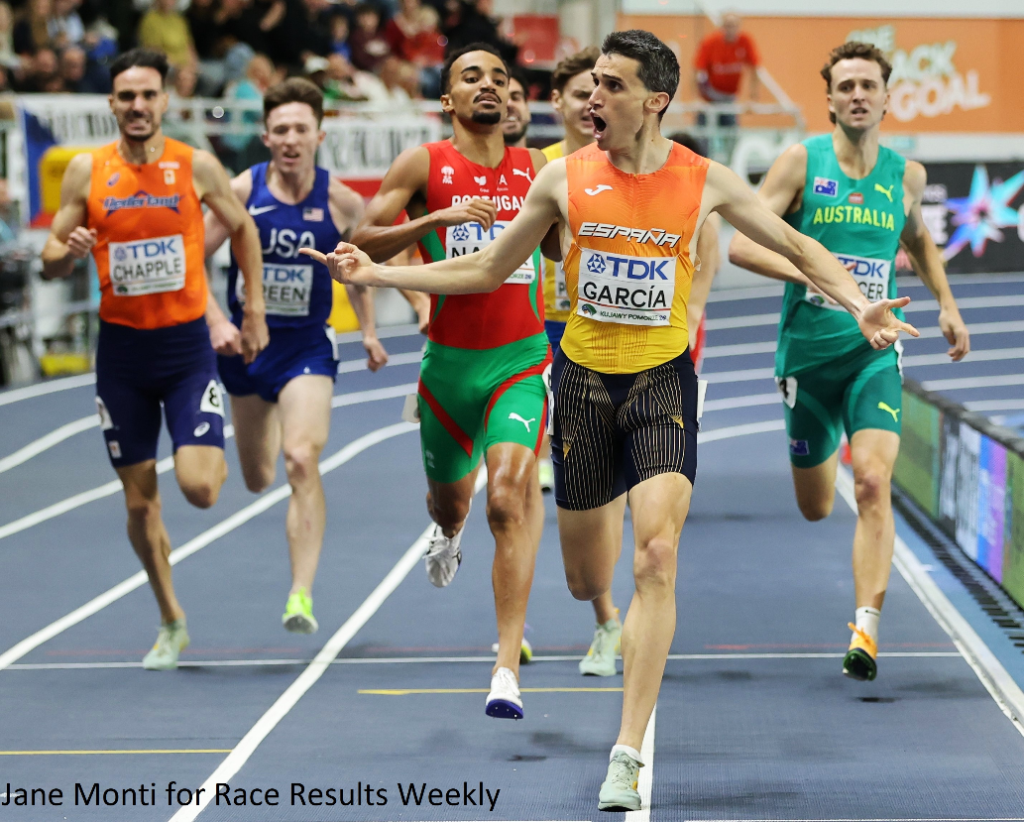 PHOTO: Mariano García of Spain winning the 1500m title at the 2026 World Athletics Indoor Championships in Toruń, Poland (photo by Jane Monti for Race Results Weekly)