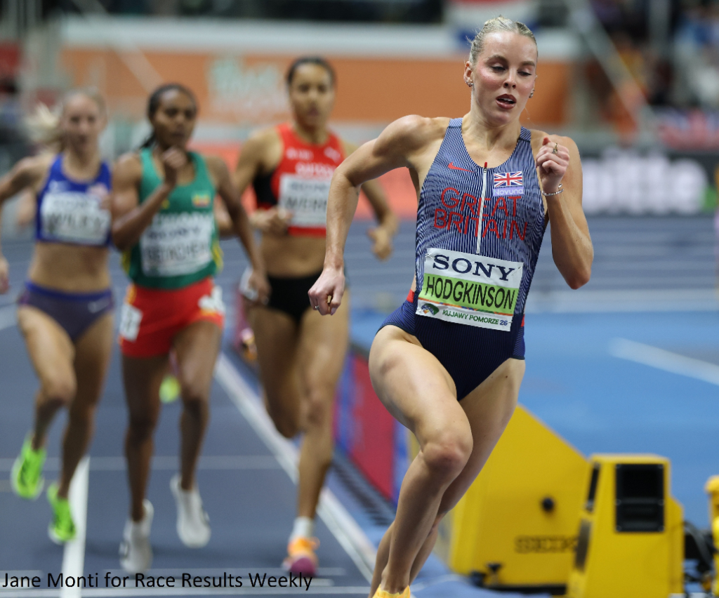 PHOTO: Keely Hodgkinson of Great Britain breaking away from the field in the women’s 800m final at the 2026 World Athletics Indoor Championships in Toruń, Poland (photo by Jane Monti for Race Results Weekly)