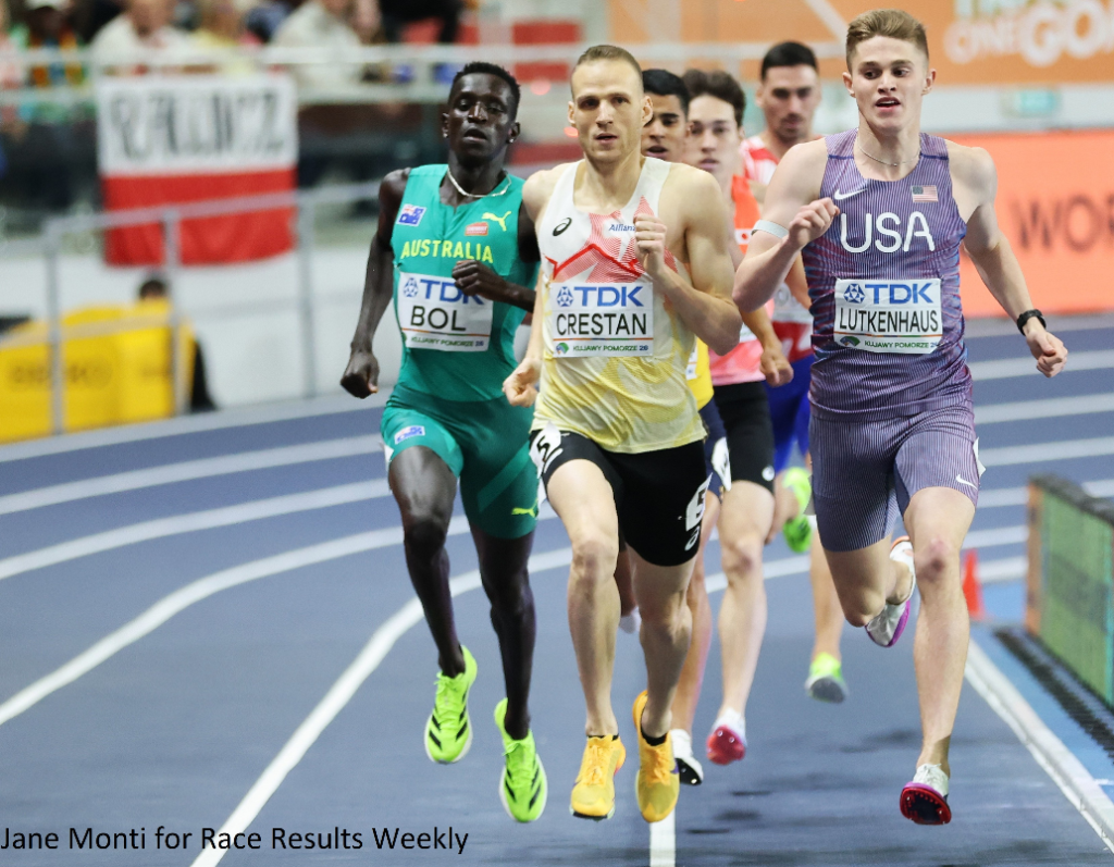 PHOTO: Cooper Lutkenhaus of the United States holds off Eliott Crestan of Belgium to win the 800m title at the 2026 World Athletics Indoor Championships in Toruń, Poland (photo by Jane Monti for Race Results Weekly)