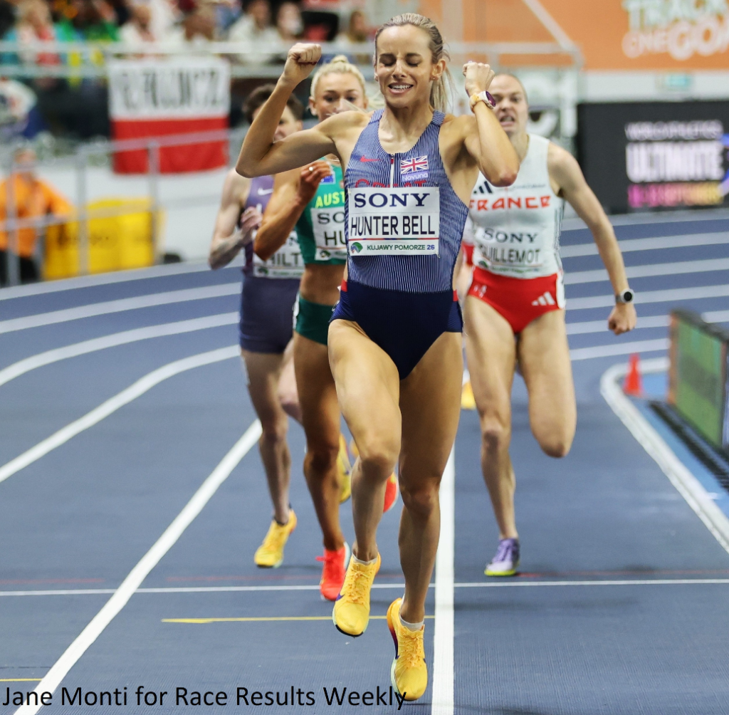 PHOTO: Georgia Hunter Bell of Great Britain winning the 1500m title at the 2026 World Athletics Indoor Championships in Toruń, Poland (photo by Jane Monti for Race Results Weekly)