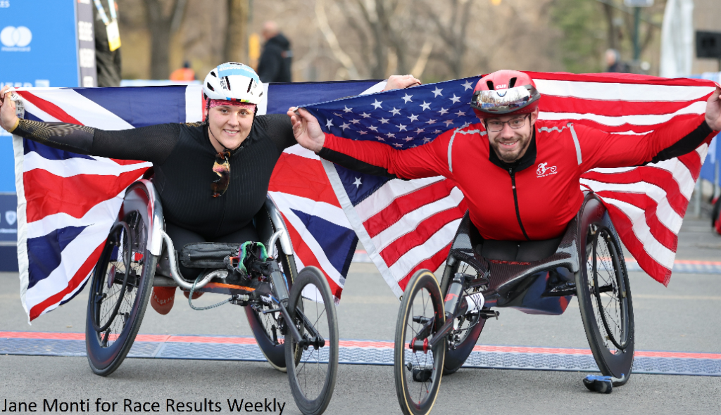 PHOTO: Eden Rainbow-Cooper (GBR) and Daniel Romanchuk (USA) were the winners of the professional wheelchair division of the 2026 United NYC Half in 54:27 and 48:10, respectively (photo by Jane Monti for Race Results Weekly)