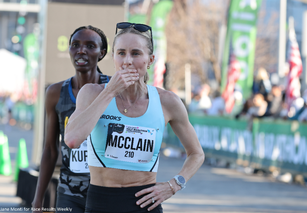 PHOTO: Jessica McClain and Ednah Kurgat moments after crossing the finish line in ninth and 13th place, respectively (photo by Jane Monti for Race Results Weekly)