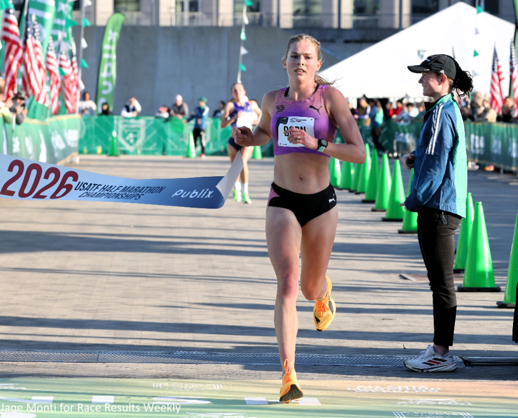 PHOTO: Molly Born winning the 2026 USATF Half-Marathon Championships, part of the Publix Marathon Weekend organized by the Atlanta Track Club (photo by Jane Monti for Race Results Weekly)