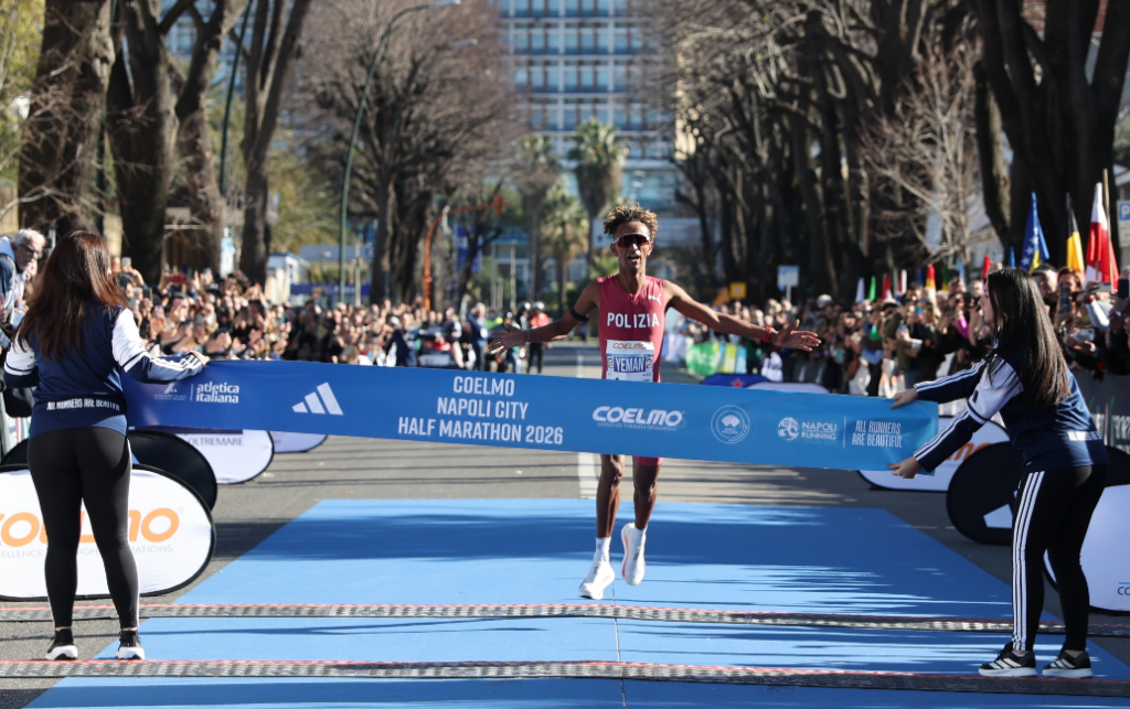 PHOTO: Yemaneberhan Crippa winning the 2026 Coelmo Napoli City Half-Marathon in a course and Italian record 59:01 (photo by Jane Monti for Race Results Weekly)