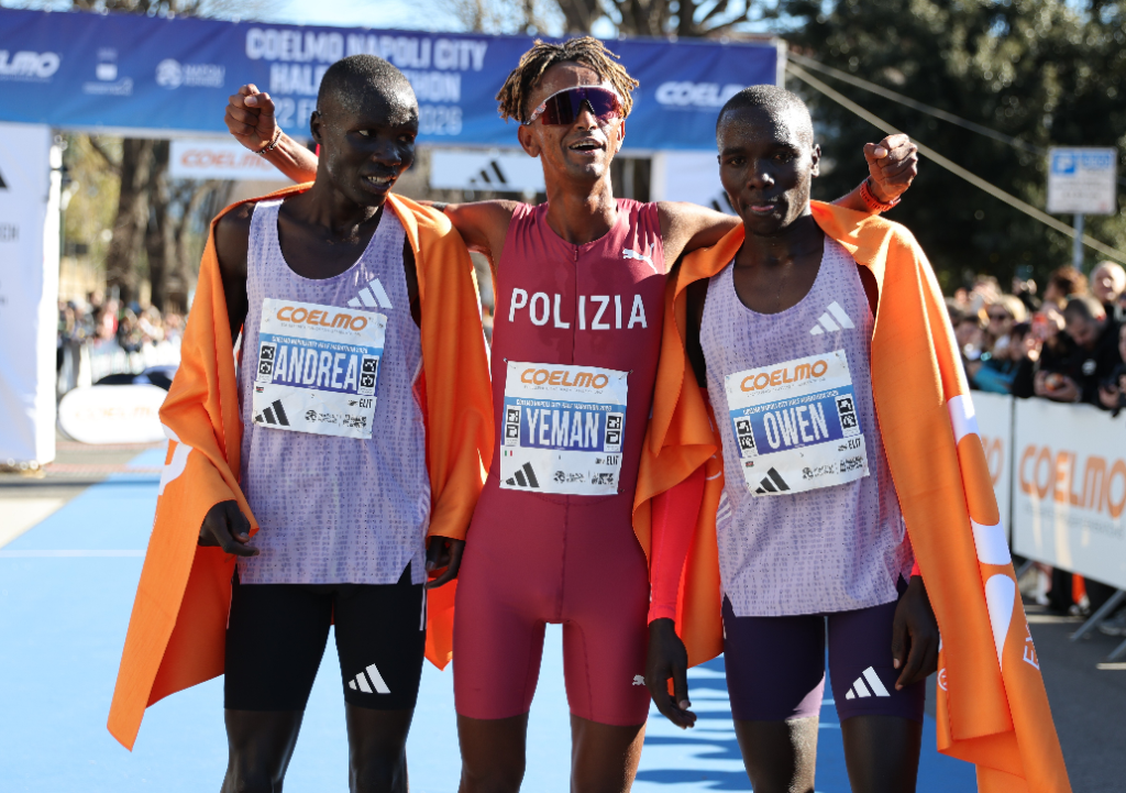 PHOTO: Yemaneberhan Crippa (center) celebrates with Andrea Kiptoo (second place) and Owen Korir Kapkama (third place) after the 2026 Coelmo Napoli City Half-Marathon (photo by Jane Monti for Race Results Weekly)